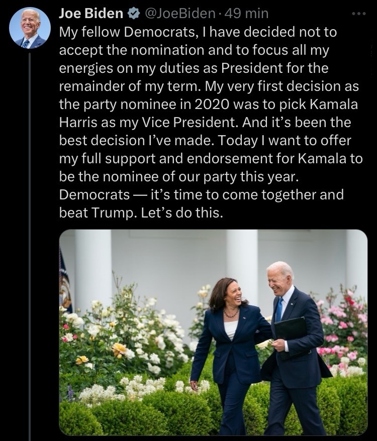 „Drodzy Demokraci, zdecydowałem się nie przyjąć tej nominacji i przez resztę mojej kadencji skoncentrować całą swoją energię na moich obowiązkach jako Prezydenta. Moją pierwszą decyzją jako kandydatki partii w 2020 r. był wybór Kamali Harris na moją wiceprzewodniczącą. I to była najlepsza decyzja, jaką podjęłam. Dziś chcę wyrazić moje pełne poparcie i akceptację dla Kamali, która będzie tegoroczną kandydatką naszej partii. Demokraci – czas się zjednoczyć i pokonać Trumpa. Zróbmy to.”